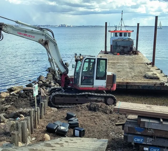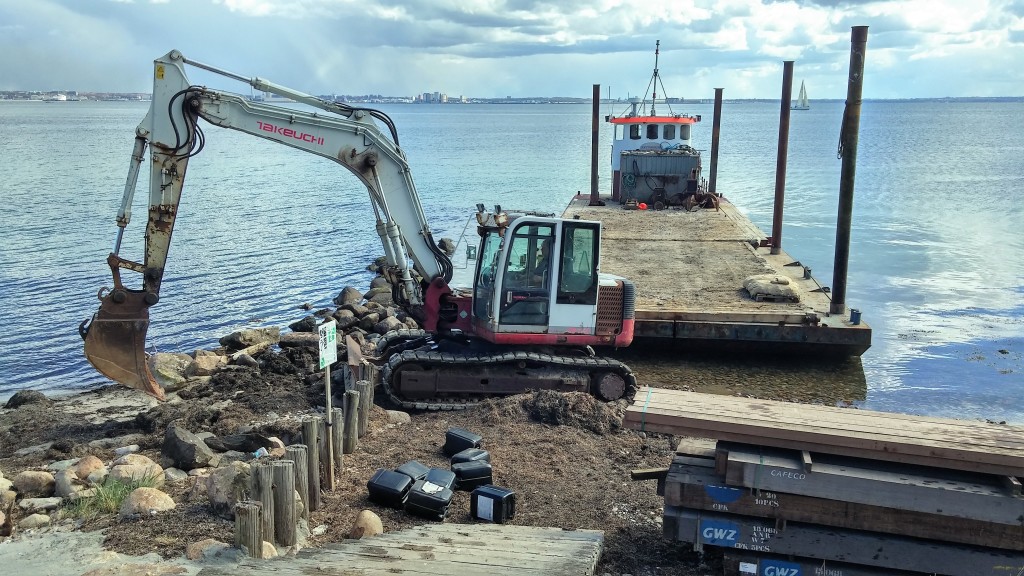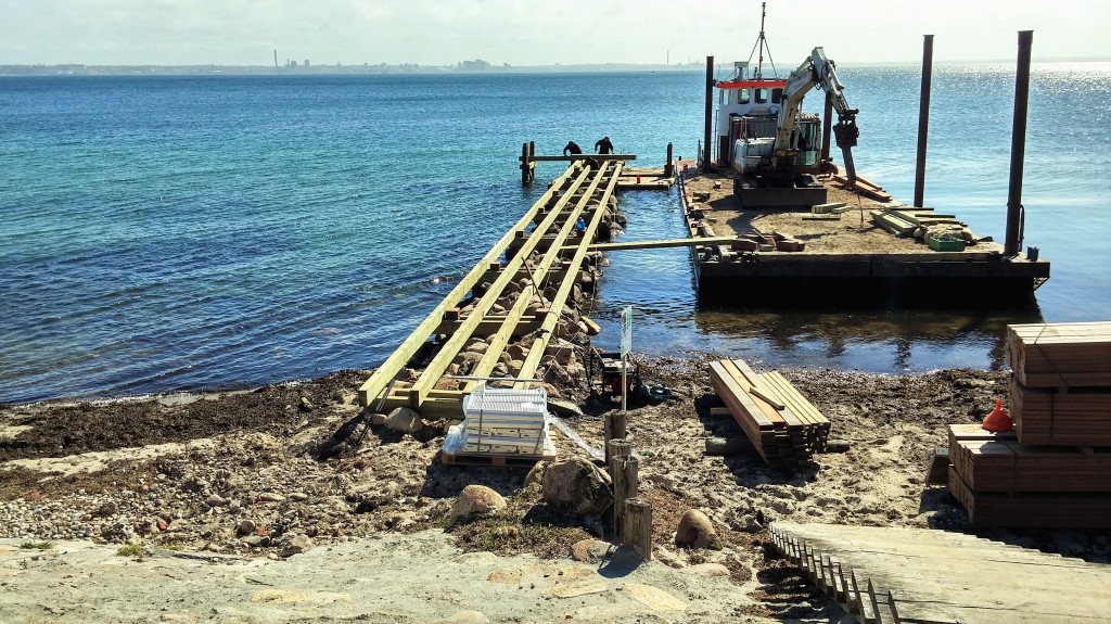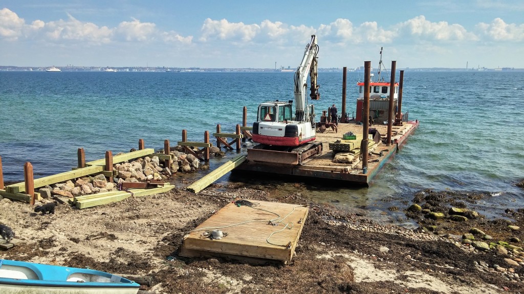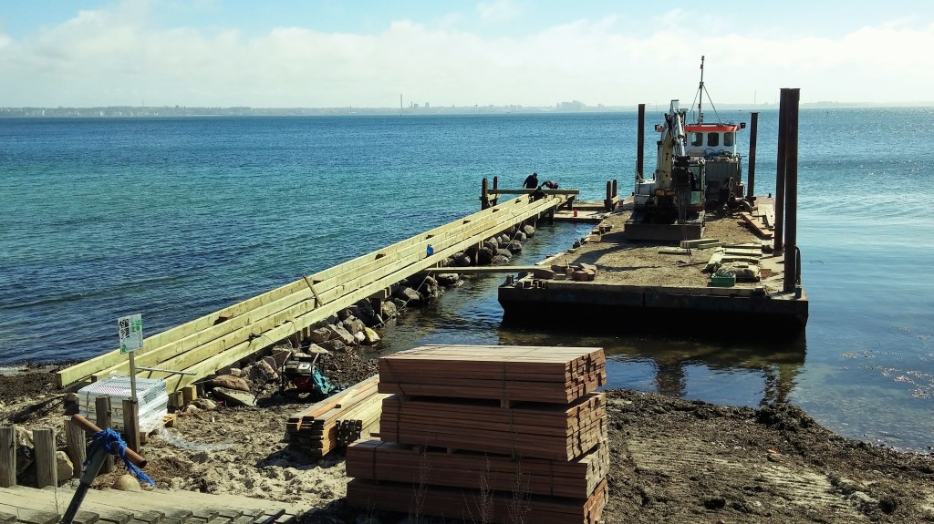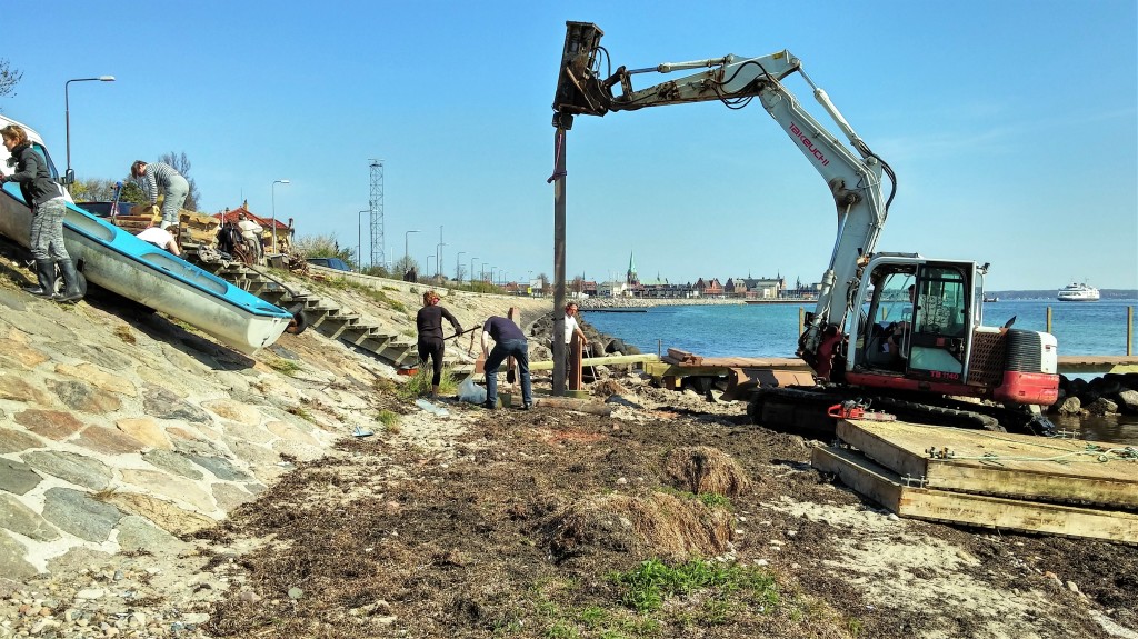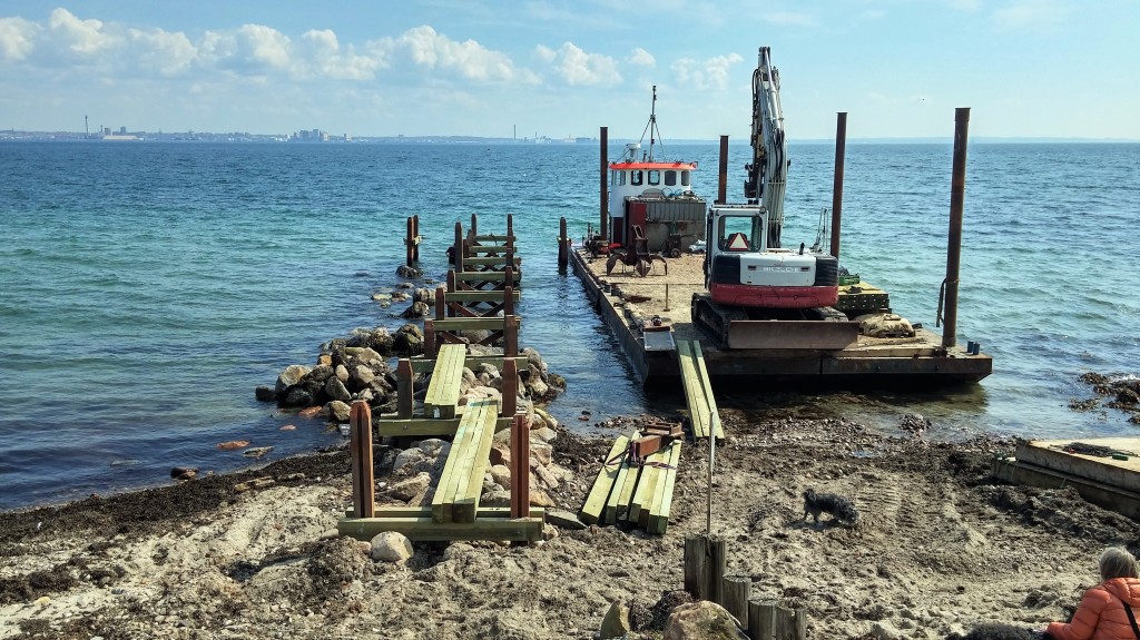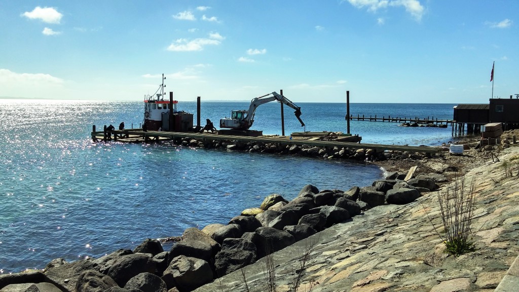 27. april 2016 - Vind og bølger hindre stadigt brobyggeriet, Kystsikring.dk har lagt maskineriet i læ i Snekkersten havn.