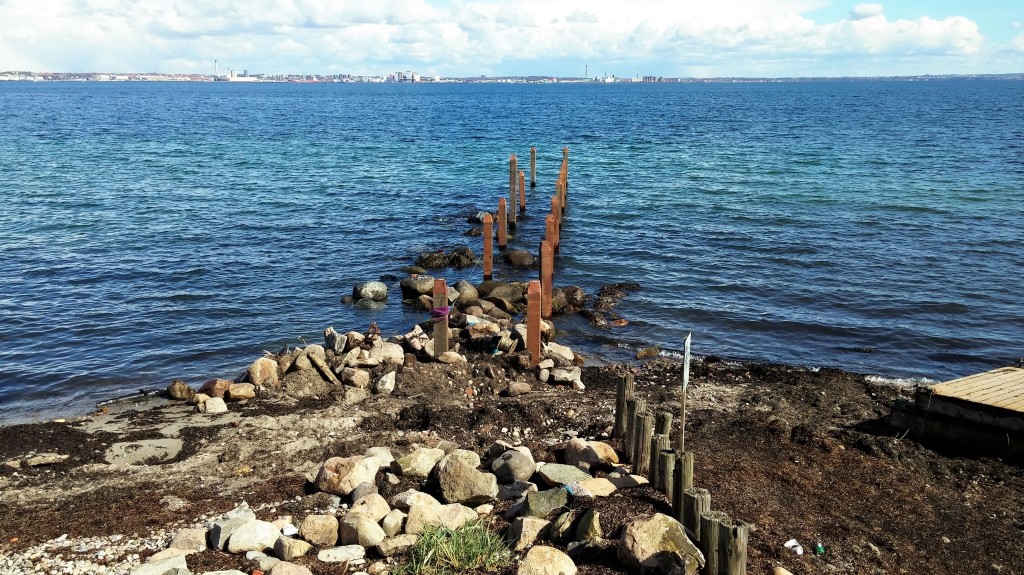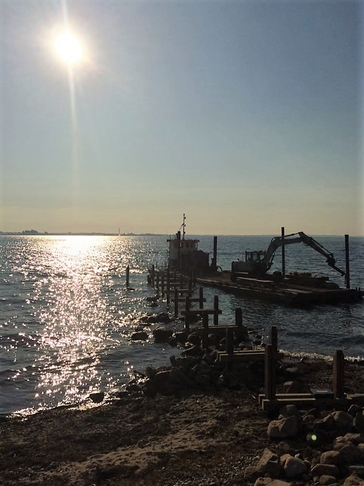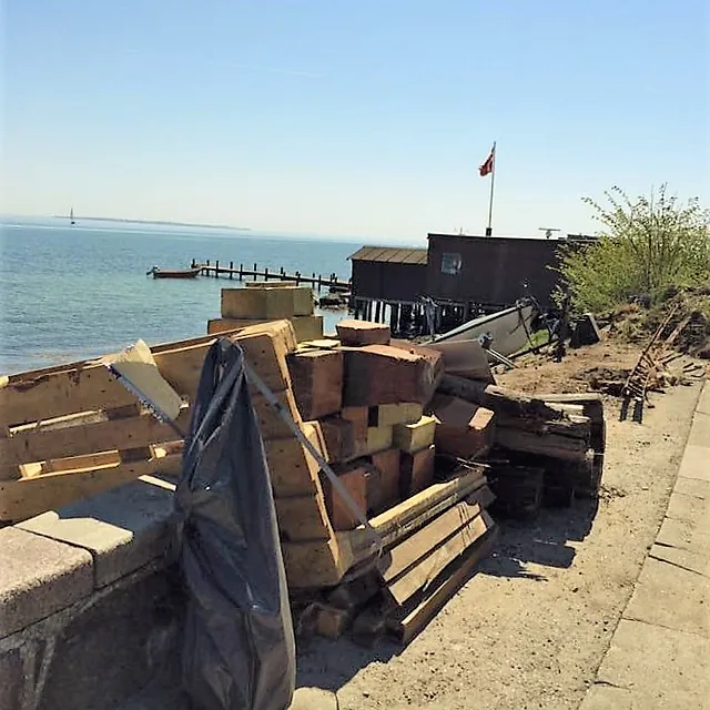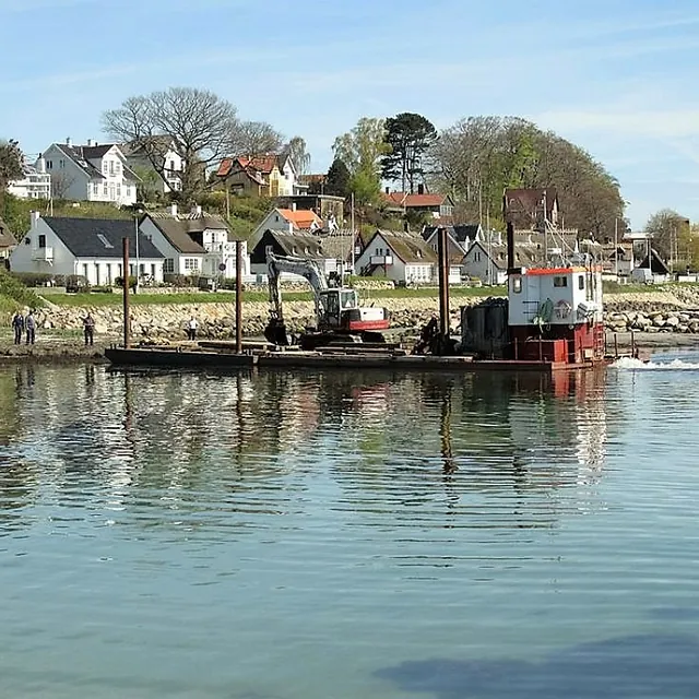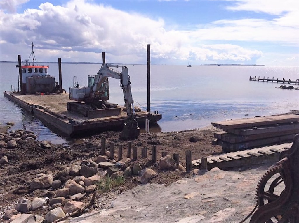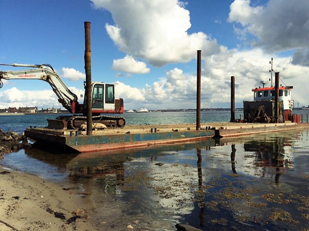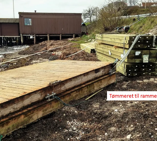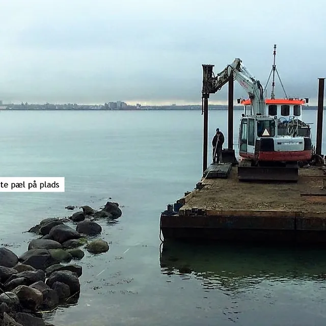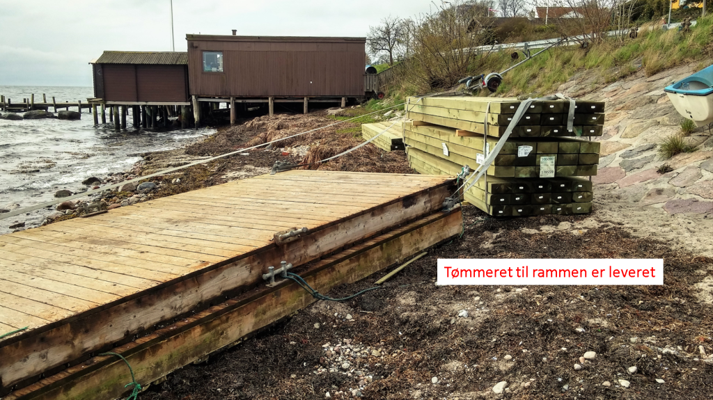 27. april 2016 - Vind og bølger hindre stadigt brobyggeriet, Kystsikring.dk har lagt maskineriet i læ i Snekkersten havn.