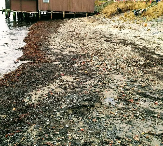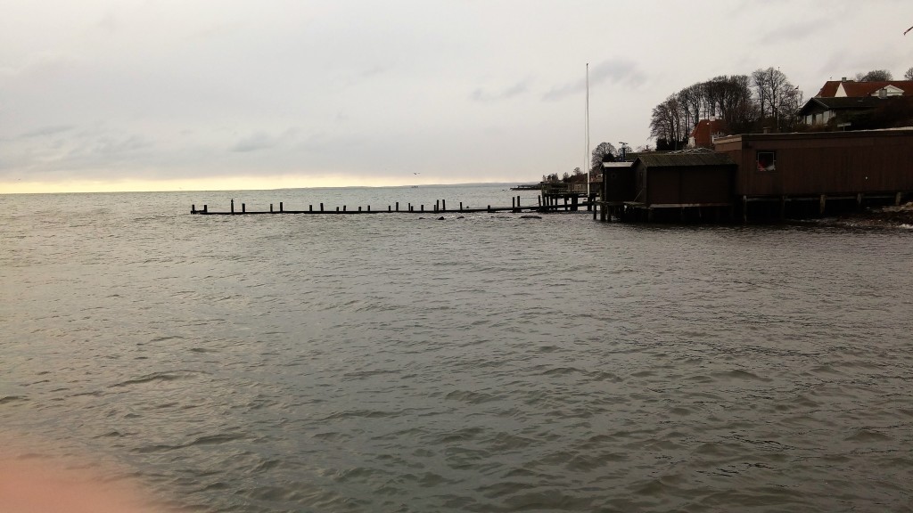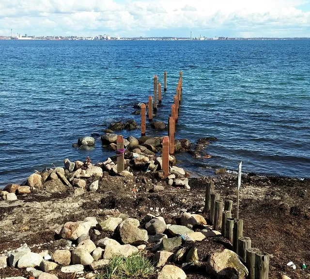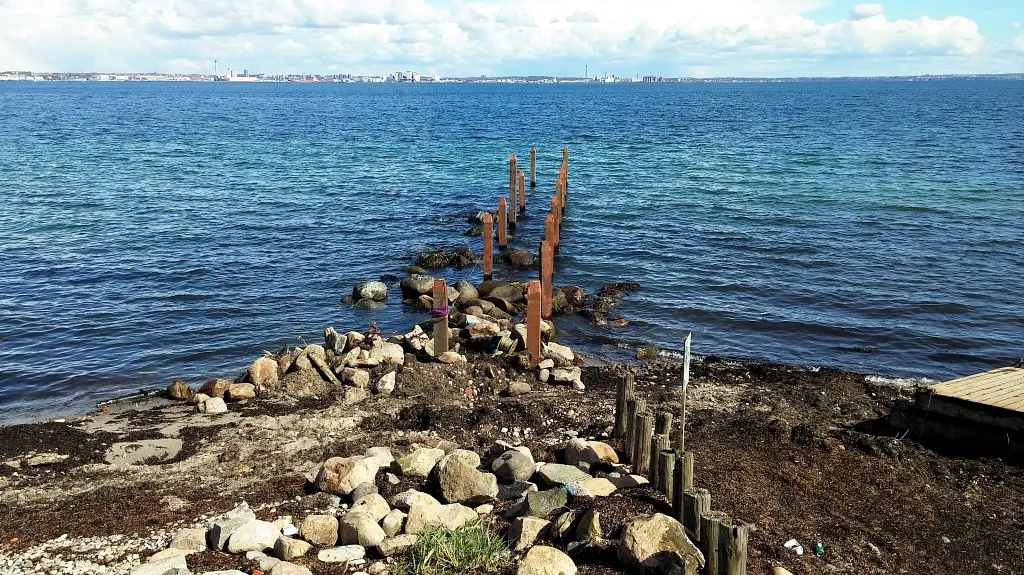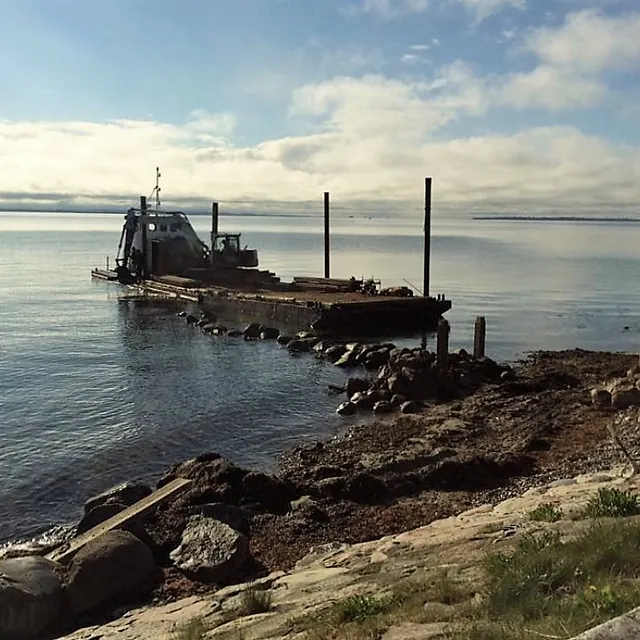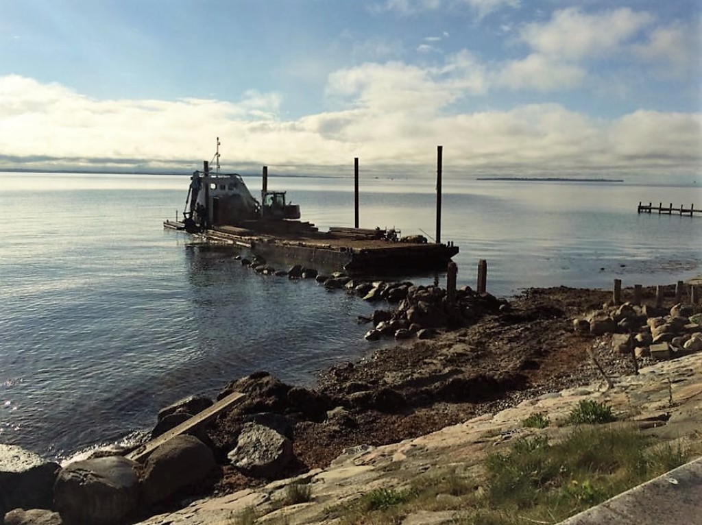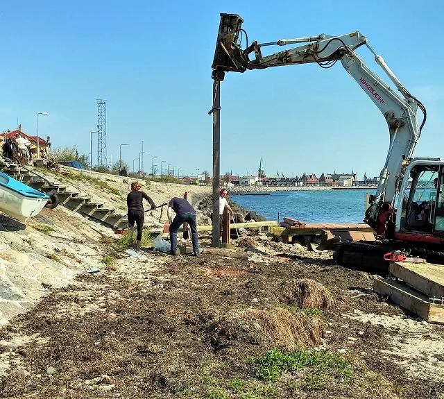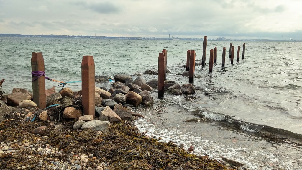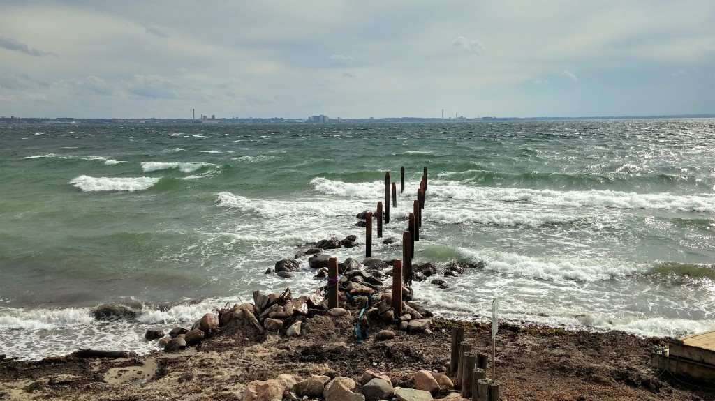 27. april 2016 - Vind og bølger hindre stadigt brobyggeriet, Kystsikring.dk har lagt maskineriet i læ i Snekkersten havn.