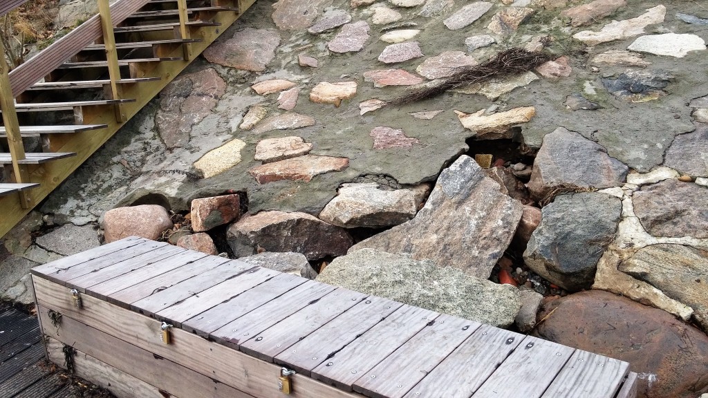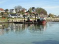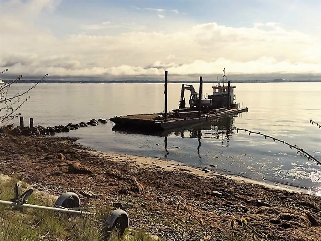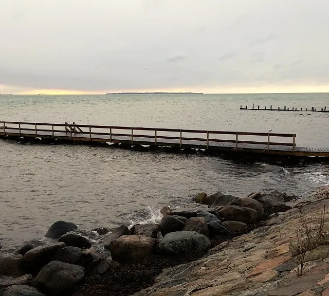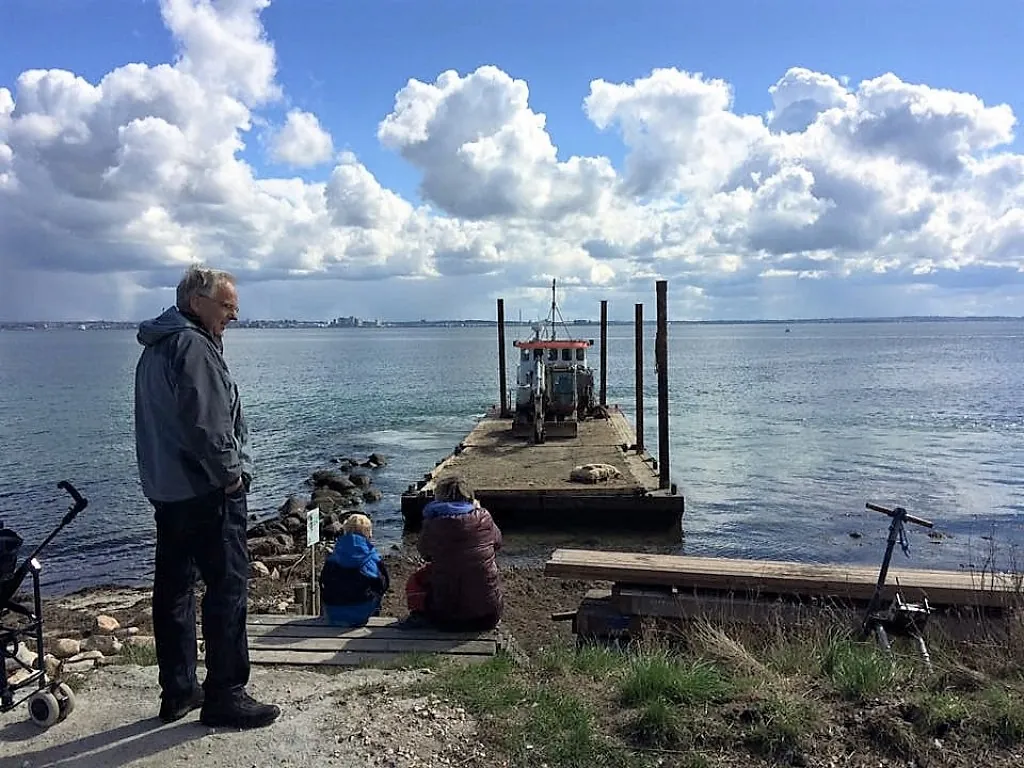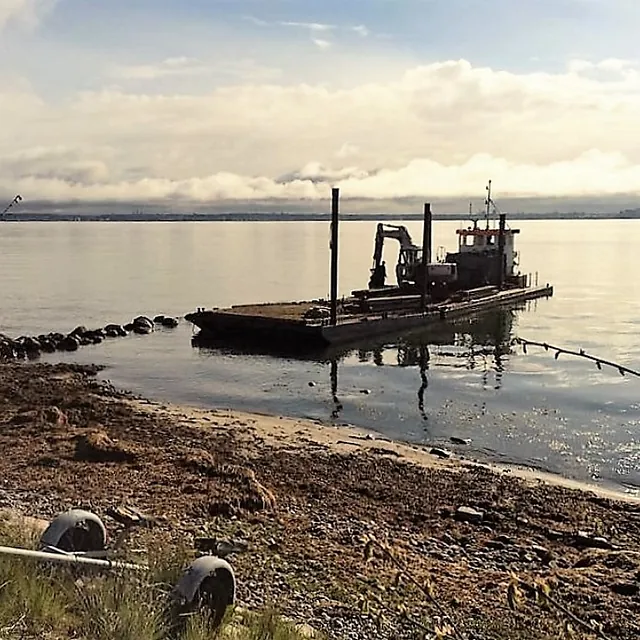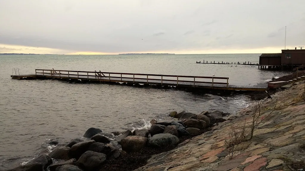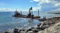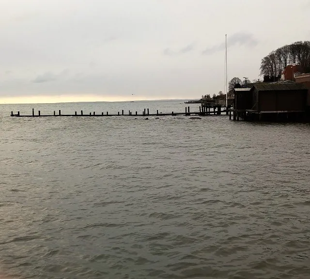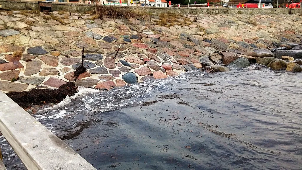 27. april 2016 - Vind og bølger hindre stadigt brobyggeriet, Kystsikring.dk har lagt maskineriet i læ i Snekkersten havn.
