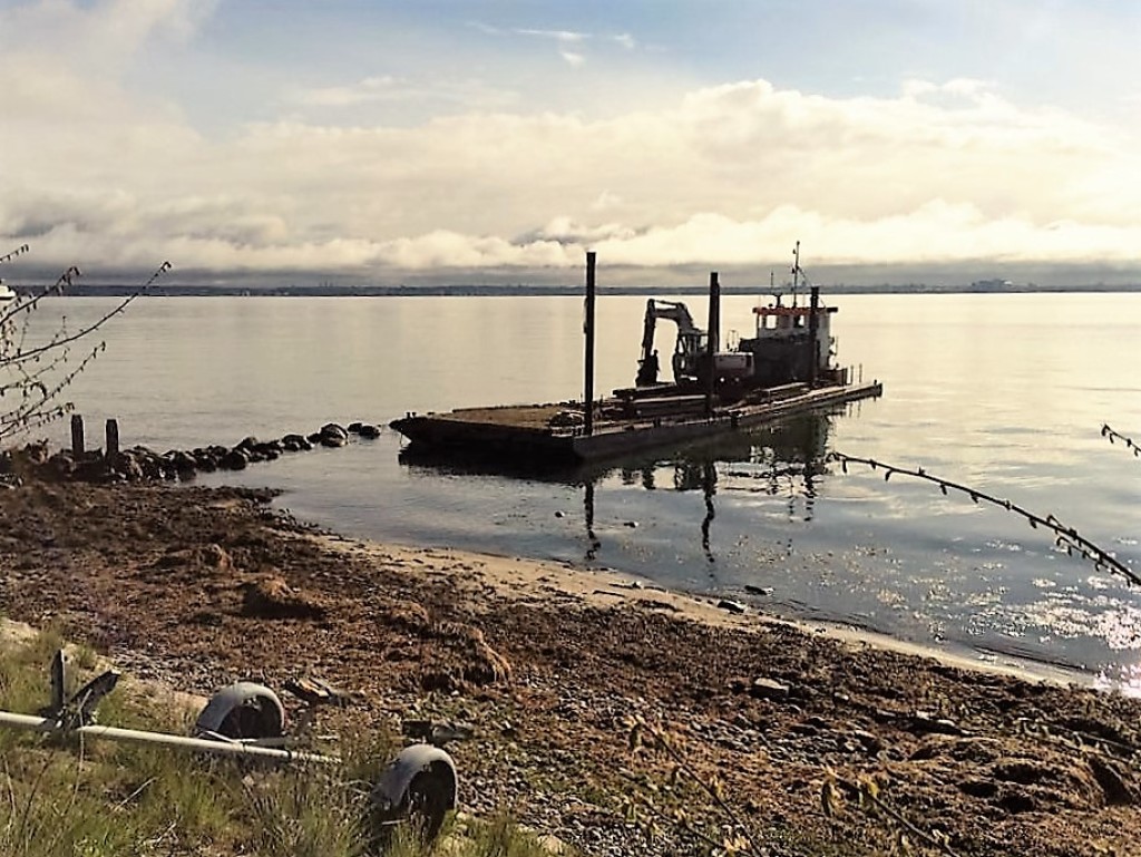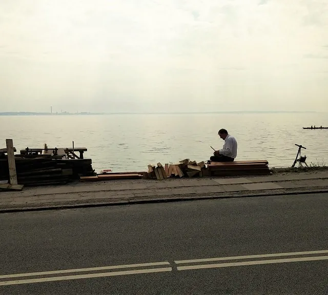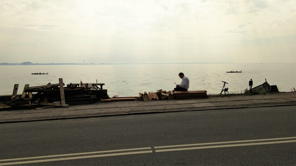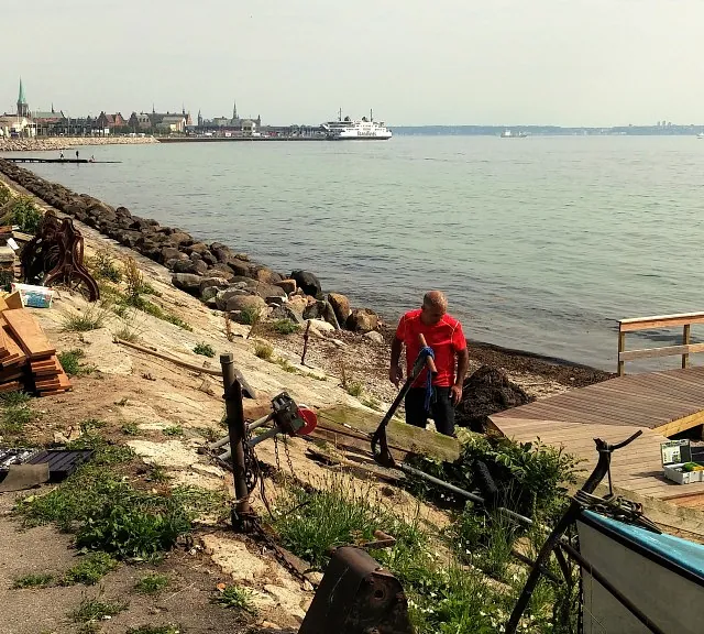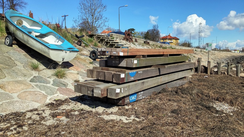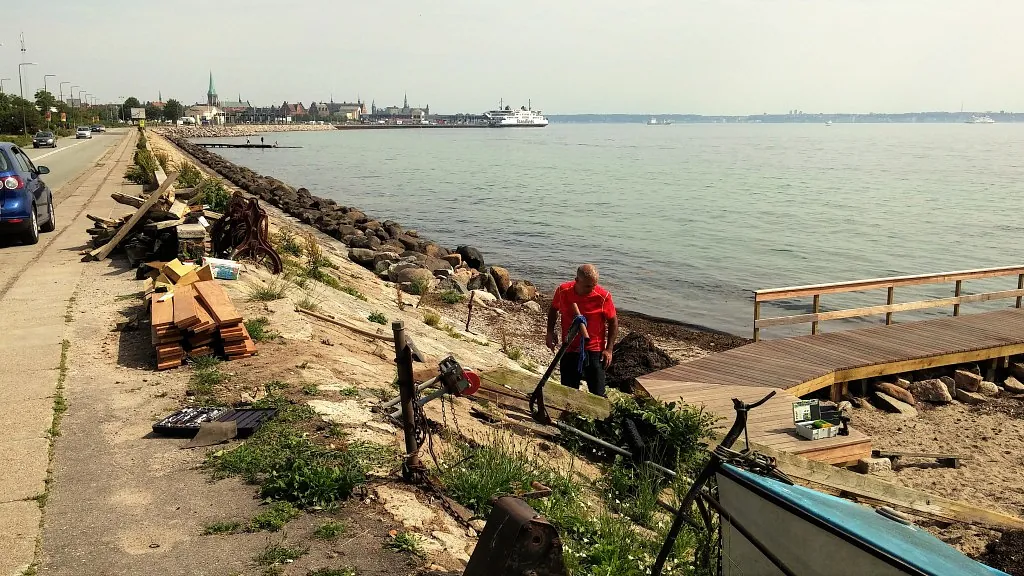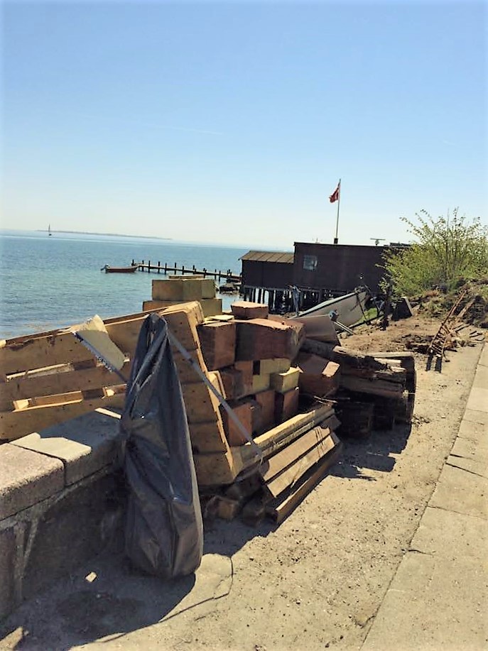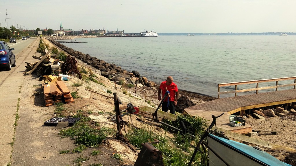 - d. 2. maj 2016, kl. 10.30 - Ingen aktivitet ved Trykkerdammen - trods smukt vejr og rolig sø - Tømmeret blev dog inspiceret af et par alternativt interesserede, som hurtigt forsvandt...og så kom arbejdet alligevel igang, efter hydraulik-problemer og lavvande i Snekkersten:0)